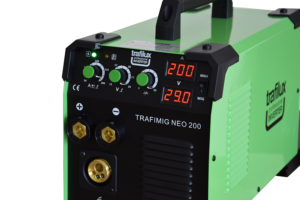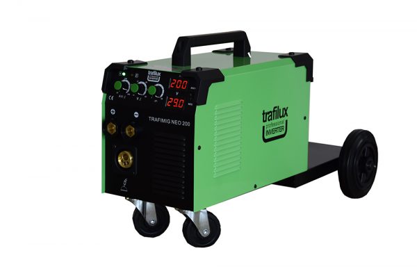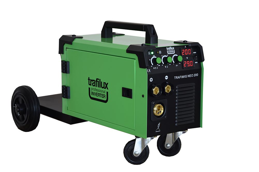 To lekki, przenośny inwenterowy półautomat spawalniczy z jezdnym podwoziem, znajdujący swoje zastosowanie w spawaniu stali niskowęglowej, niskostopowej MAG, stali stopowej MIG oraz stopów aluminium. Ponadto umożliwia zastosowanie drutów samoosłonowych - rdzeniowych, służących do spawania bez dodatkowego gazu osłonowego. Urządzenie zapewnia możliwość spawania elektrodami otulonymi (funkcja MMA). TRAFIMIG 200A MMA jest stworzony do spawania konstrukcji lekkich w warunkach gospodarstwa domowego oraz warsztatowych, swoje zastosowanie znajdzie podczas prac naprawczych, montażowych oraz prac w terenie. Urządzenie dużą funkcjonalność zawdzięcza podwoziu ze skrętnymi kołami, umożliwiającemu wygodne przemieszczanie spawarki wraz z butlą gazu osłonowego. Atutem konstrukcyjnym urządzenia są tranzystory wykonane w technologii IGBT. Cechą charakterystyczną dla tego typu tranzystorów jest, mniejsze zużycie energii, mniejsze zakłócenia elektromagnetyczne, przy większej wydajności oraz mocniejszym i stabilniejszym TRAFILUX TRAFIMIG NEO 200 łuku spawalniczym.
