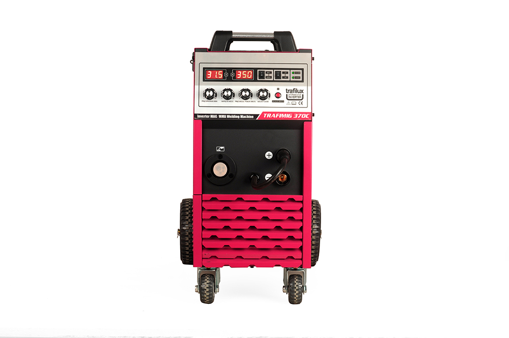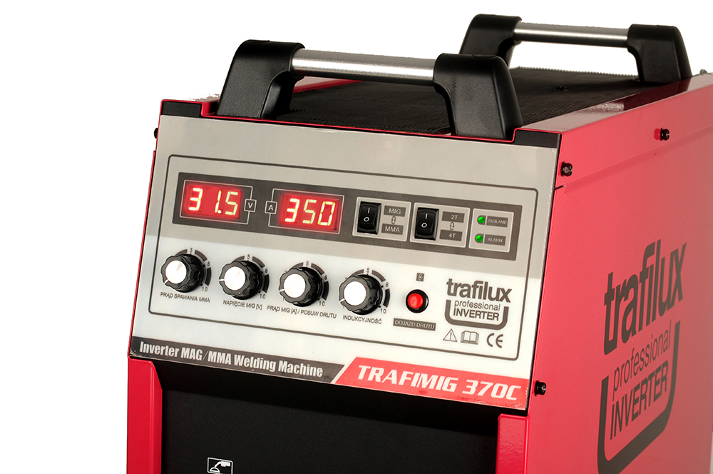 To profesjonalny inwentorowy półautomat spawalniczy, znajdujący swoje zastosowanie w spawaniu stali niskowęglowej, niskostopowej MAG,stali stopowej MIG oraz stopów aluminium. Ponadto umożliwia zastosowanie drutów samoosłonowych -rdzeniowych, służących do spawania bez dodatkowego gazu osłonowego. Urządzenie zapewnia możliwość spawania elektrodami otulonymi (funkcja MMA), lub spawanie metodą TIG LIFT przy zastosowaniu uchwytu z zaworem w rękojeści. TRAFIMIG 370C jest stworzony do spawania konstrukcji średnich oraz lekkich w warunkach warsztatowych, jak i przemysłowych. Urządzenie może być użytkowane zarówno wewnątrz, jak i na zewnątrz pomieszczeń zamkniętych. Przednie koła skrętne, oraz podwozie z miejscem na butle ułatwia przemieszczanie urządzenia po nierównym podłożu. Urządzenia wyposażone jest w dwa wyświetlacze parametrów pracy: natężenia, napięcia prądu, oraz polski panel językowy. Atutem konstrukcyjnym urządzenia są tranzystory wykonane w technologii IGBT. Cechą charakterystyczną dla tego typu tranzystorów jest, mniejsze zużycie energii, mniejsze zakłócenia elektromagnetyczne, przy większej wydajności oraz mocniejszym i stabilniejszym łukuspawalniczym.
