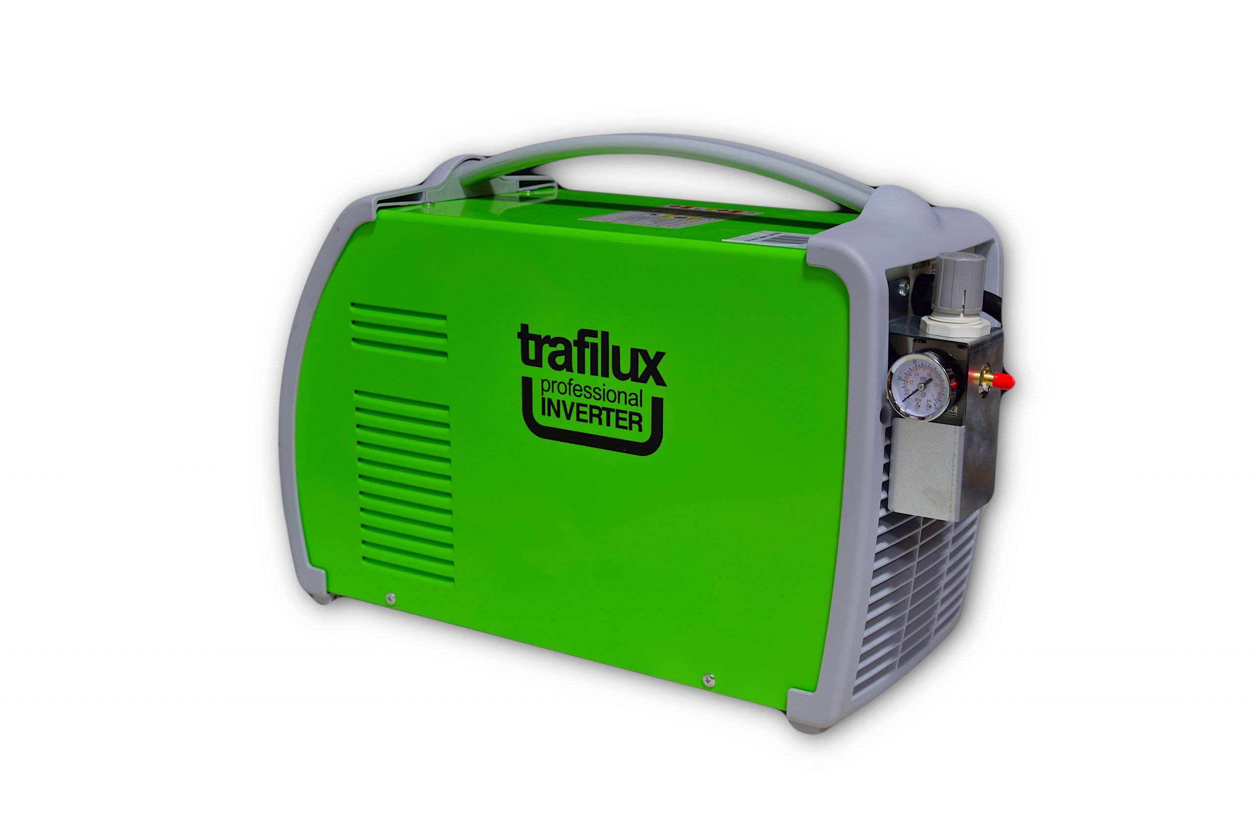 To inwentorowa przecinarka plazmowa, do cięcia ręcznego lub maszynowego, zasilana z sieci 3-fazowej, wyposażona w system zajarzania bezstykowego HF. Przeznaczona do prac w warunkach halowych, warsztatowych, produkcyjnych. Swoje zastosowanie znajduję w zamkniętych pomieszczeniach, jak i pracach terenowych np. przy cięciu złomu, odpadów metalowych. Zaletą tego urządzenia jest wysoka jakość wykonania, solidność i trwałość zastosowanych komponentów elektronicznych. Plazma 100 CNC posiada możliwość pracy z automatycznymi wypalarkami, cyfrowy wyświetlacz prądu cięcia, płynną regulację opóźnienia wypływu gazu, oraz 2takt/4takt, możliwość podłączenia chłodnicy. Na tylnym panelu znajduję się wbudowany zespół przygotowania powietrza z reduktorem i manometrem. Urządzenie służy do cięcia różnego rodzaju metali, w tym stopów stali, miedzi, mosiądzu, aluminium. Przecinarka plazmowa TRAFILUX, zapewnia możliwość cięcia w wielu płaszczyznach, oraz w trudno dostępnych miejscach. Palnik plazmowy dołączony do urządzenia jest wysokiej klasyoryginalnym palnikiem TRAFIMET A101, który umożliwia zastosowanie różnego rodzaju nasadek oraz dysz tnących, dzięki czemu istnieje możliwość konfiguracji palnika pod indywidualne potrzeby użytkownika. Atutem konstrukcyjnym urządzenia są tranzystory wykonane w technologii IGBT. Cechą charakterystyczną dla tego typu tranzystorów jest, mniejsze zużycie energii, mniejsze zakłócenia elektromagnetyczne, przy większej wydajności oraz mocniejszym i stabilniejszym łuku.