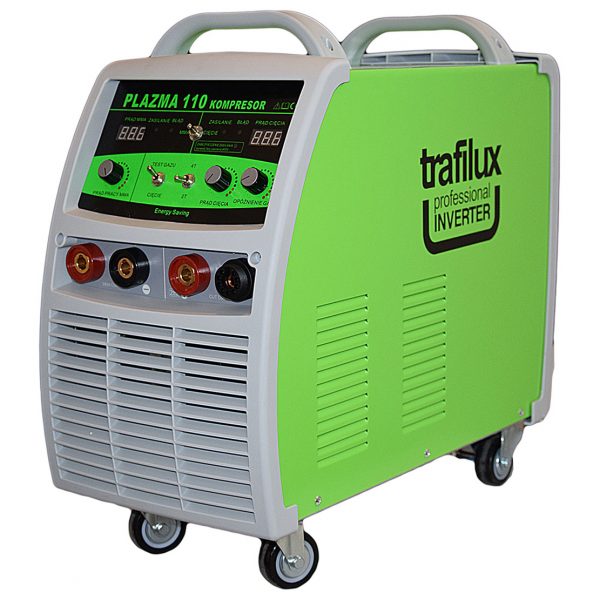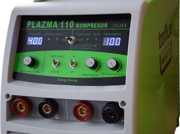 To inwentorowa przecinarka plazmowa do cięcia ręcznego lub maszynowego, wyposażona w wbudowany kompresor oraz moduł MMA, służąc do spawania elektrodami otulonymi. Urządzenie posiada moduł HF powodujący bezstykowe zajarzenie łuku plazmowego. Urządzenie stworzone z myślą o użytkowaniu w warunkach warsztatowych jaki i przemysłowych. Urządzenie jest niezastąpione w przypadku prac terenowych, ponieważ skupia w sobie 3 urządzenia, dając możliwość cięcia plazmowego bez konieczności zasilania przez zewnętrzny kompresor, oraz możliwość spawania do 400A elektrodą otuloną rutylową lub zasadową. Uniwersalność urządzenia czynie je znakomitym narzędziem do przeprowadzania wszelkich prac polowych np. cięcia złomu, odpadów metalowych, prac naprawczych z wykorzystaniem modułu MMA. Urządzenie posiada koła transportowe umożliwiające łatwe przemieszczanie, waga całego kompletu to jedyne 49 KG, co jest dobrym wynikiem jak na moduł 3w1. Przecinarka posiada funkcję testu gazu, umożliwiającą ustawienie odpowiedniego przepływu powietrza dla uchwytu plazmowego, zajarzenie łuku w trybach 2taktu lub 4 taktu, oraz opóźnienie wypływu powietrza. Urządzenie sprawdzi się podczas cięcia różnego typu metalów np. stopów stali, miedzi, mosiądzu, aluminium. Plazma 110 wyposażona jest w oryginalny palnik TRAFIMET A101 – 6m, dający możliwość stosowani różnych konfiguracji części zamiennych, nasadek, cyrkli oraz części do żłobienia, czy też cięcia kontaktowego. Atutem urządzenia są tranzystory wykonane w technologii IGBT, dające mniejsze zużycie energii, mniejsze zakłócenia elektromagnetyczne przy jednocześnie większej wydajności oraz bardziej stabilnym łuku.