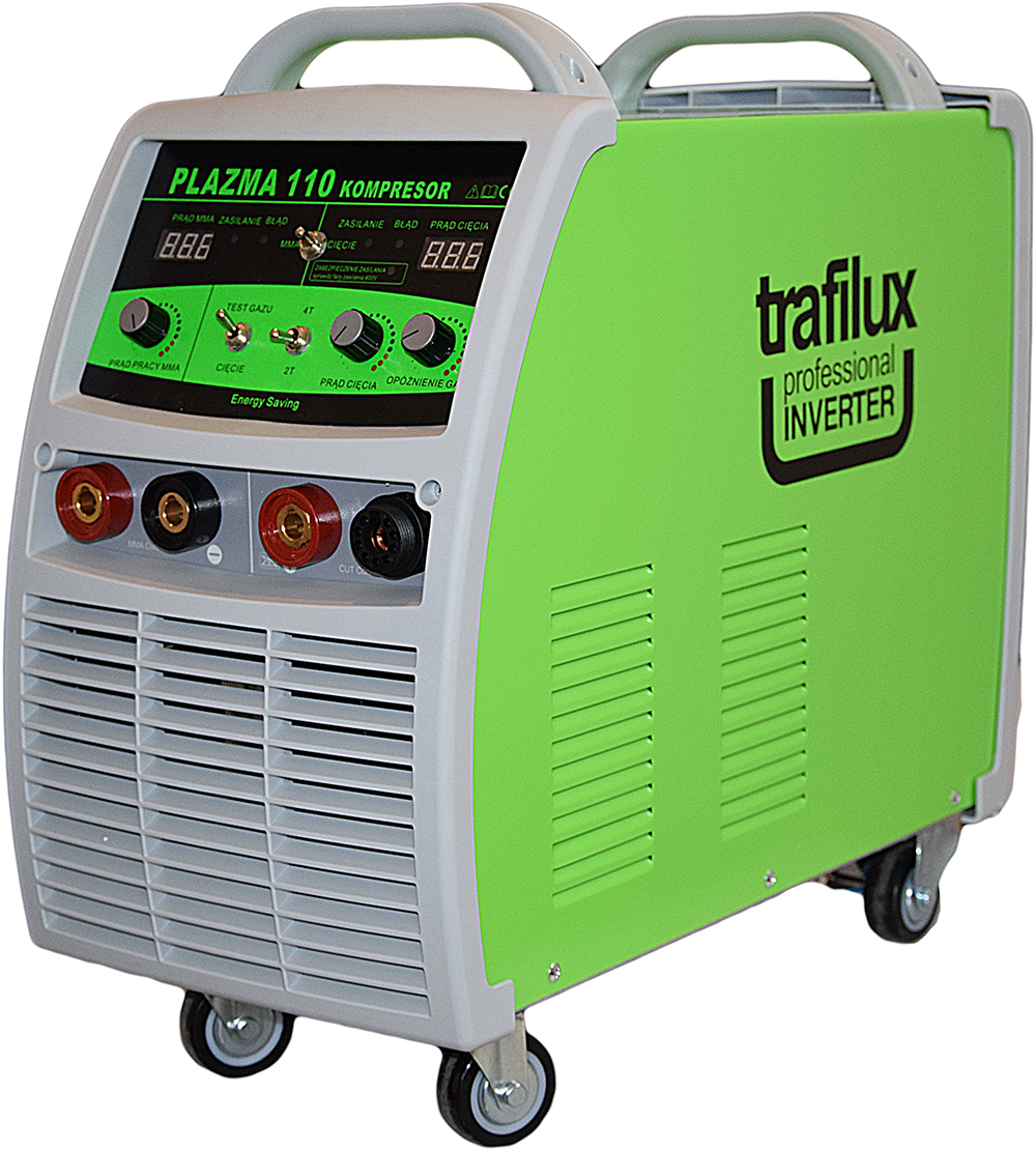To inwentorowa przecinarka plazmowa do cięcia ręcznego lub maszynowego, wyposażona w wbudowany kompresor oraz moduł MMA, służąc do spawania elektrodami otulonymi. Urządzenie posiada moduł HF powodujący bezstykowe zajarzenie łuku plazmowego. Urządzenie stworzone z myślą o użytkowaniu w warunkach warsztatowych jaki i przemysłowych. Urządzenie jest niezastąpione w przypadku prac terenowych, ponieważ skupia w sobie 3 urządzenia, dając możliwość cięcia plazmowego bez konieczności zasilania przez zewnętrzny kompresor, oraz możliwość spawania do 400A elektrodą otuloną rutylową lub zasadową. Uniwersalność urządzenia czynie je znakomitym narzędziem do przeprowadzania wszelkich prac polowych np. cięcia złomu, odpadów metalowych, prac naprawczych z wykorzystaniem modułu MMA. Urządzenie posiada koła transportowe umożliwiające łatwe przemieszczanie, waga całego kompletu to jedyne 49 KG, co jest dobrym wynikiem jak na moduł 3w1. Przecinarka posiada funkcję testu gazu, umożliwiającą ustawienie odpowiedniego przepływu powietrza dla uchwytu plazmowego, zajarzenie łuku w trybach 2taktu lub 4 taktu, oraz opóźnienie wypływu powietrza. Urządzenie sprawdzi się podczas cięcia różnego typu metalów np. stopów stali, miedzi, mosiądzu, aluminium. Plazma 110 wyposażona jest w oryginalny palnik TRAFIMET A101 – 6m, dający możliwość stosowani różnych konfiguracji części zamiennych, nasadek, cyrkli oraz części do żłobienia, czy też cięcia kontaktowego. Atutem urządzenia są tranzystory wykonane w technologii IGBT, dające mniejsze zużycie energii, mniejsze zakłócenia elektromagnetyczne przy jednocześnie większej wydajności oraz bardziej stabilnym łuku.